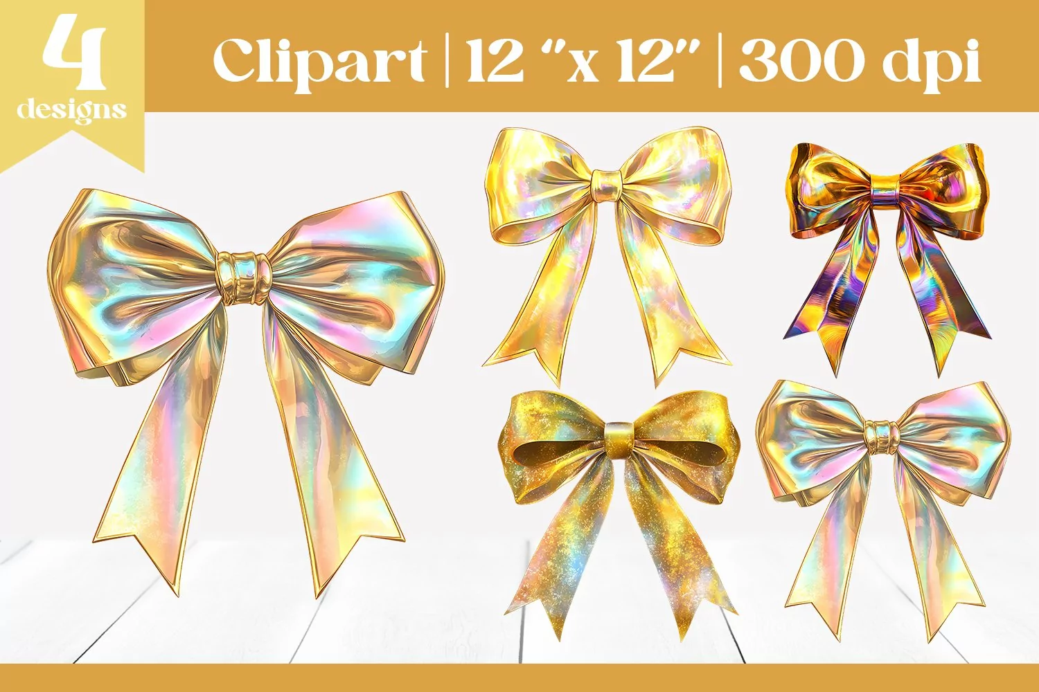 Add a touch of elegance and sparkle to your creative projects with these gold holographic bows in a coquette style. Perfect for sublimation, gift wrapping designs, holiday decor, and more. The shimmering metallic effect makes them ideal for luxurious projects.