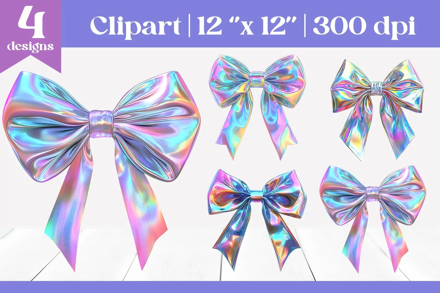 This set of 4 iridescent holographic bows radiates elegance with their coquette style and colorful shimmer. Perfect for sublimation designs, gift packaging, party decor, or craft projects. These high-resolution bows will enhance any creative project with their luxurious holographic finish.