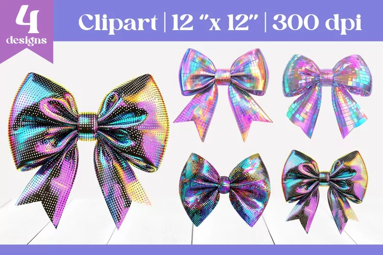 Add some shine and retro vibes to your creative projects with this set of 4 holographic disco bows featuring shimmering coquette details and vibrant iridescence. Ideal for sublimation designs, digital crafting, or party decorations, these bows are perfect for creating a glamorous, disco-inspired look.