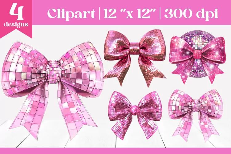 Add a touch of playful glamour with this set of 4 pink disco bows featuring shimmering glitter and coquette aesthetics. Perfect for sublimation projects, digital designs, party decor, and DIY crafts, these vibrant and retro-inspired bows will bring any design to life.