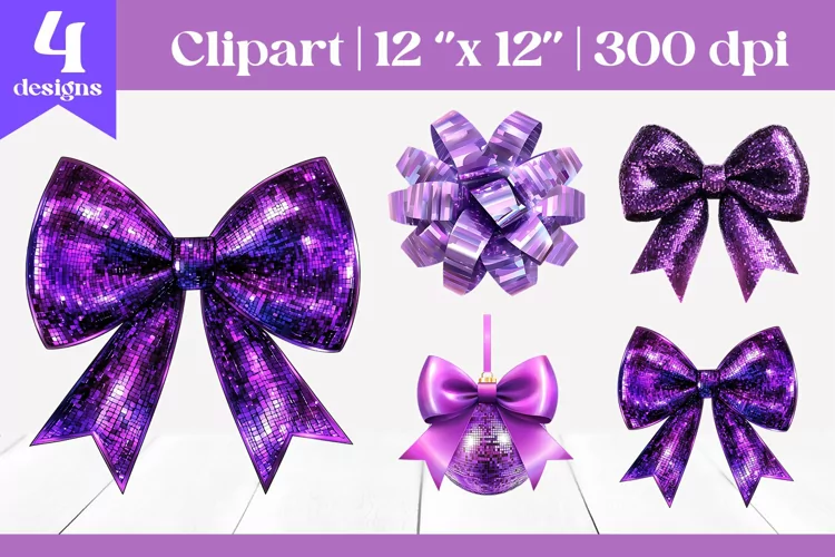 Add a touch of glam and sparkle to your creative projects with this set of 4 purple disco ball bows. The combination of glitter and coquette style makes these designs perfect for sublimation, party decor, gift wrapping, and more. Ideal for modern DIY crafting, t-shirts, and festive embellishments.