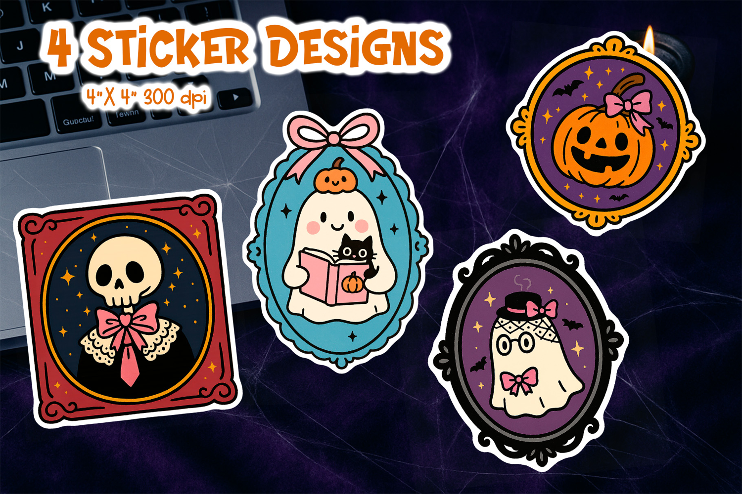 Bring a charmingly spooky vibe to your Halloween crafts with this vintage frame sticker printable featuring a dapper skeleton, a cozy ghost reading with a kitten, a smiling pumpkin with bow, and a nerdy ghost in a hat. These bold cartoon illustrations with coquette bows and pastel accents are perfect for seasonal decor and gift embellishments.