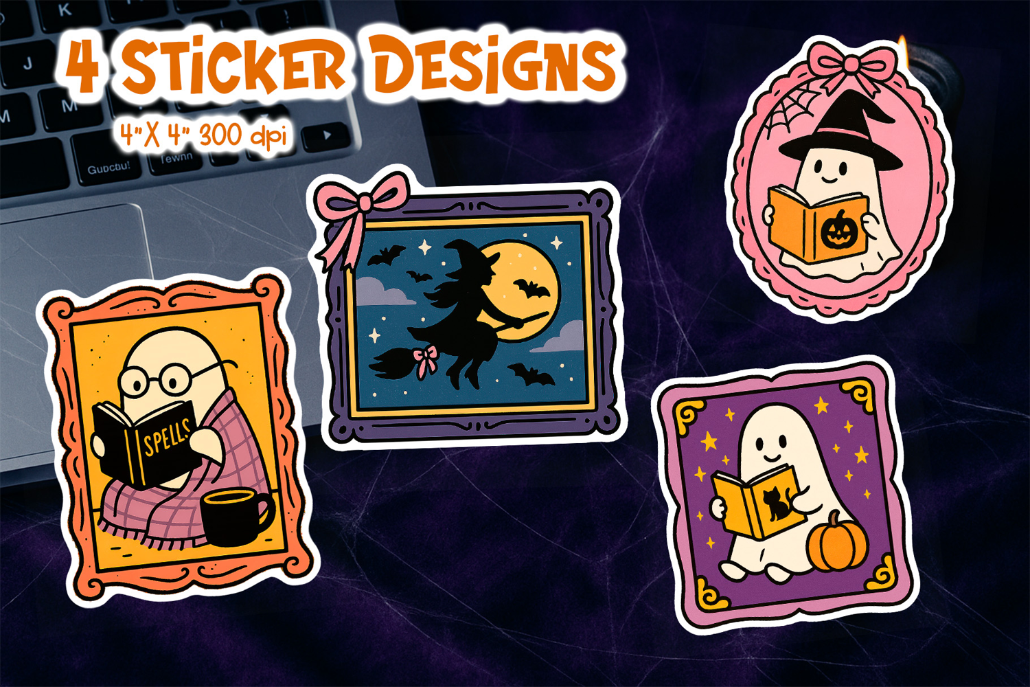 Halloween Vintage Frame Sticker | Cozy Ghost Witch Book Art