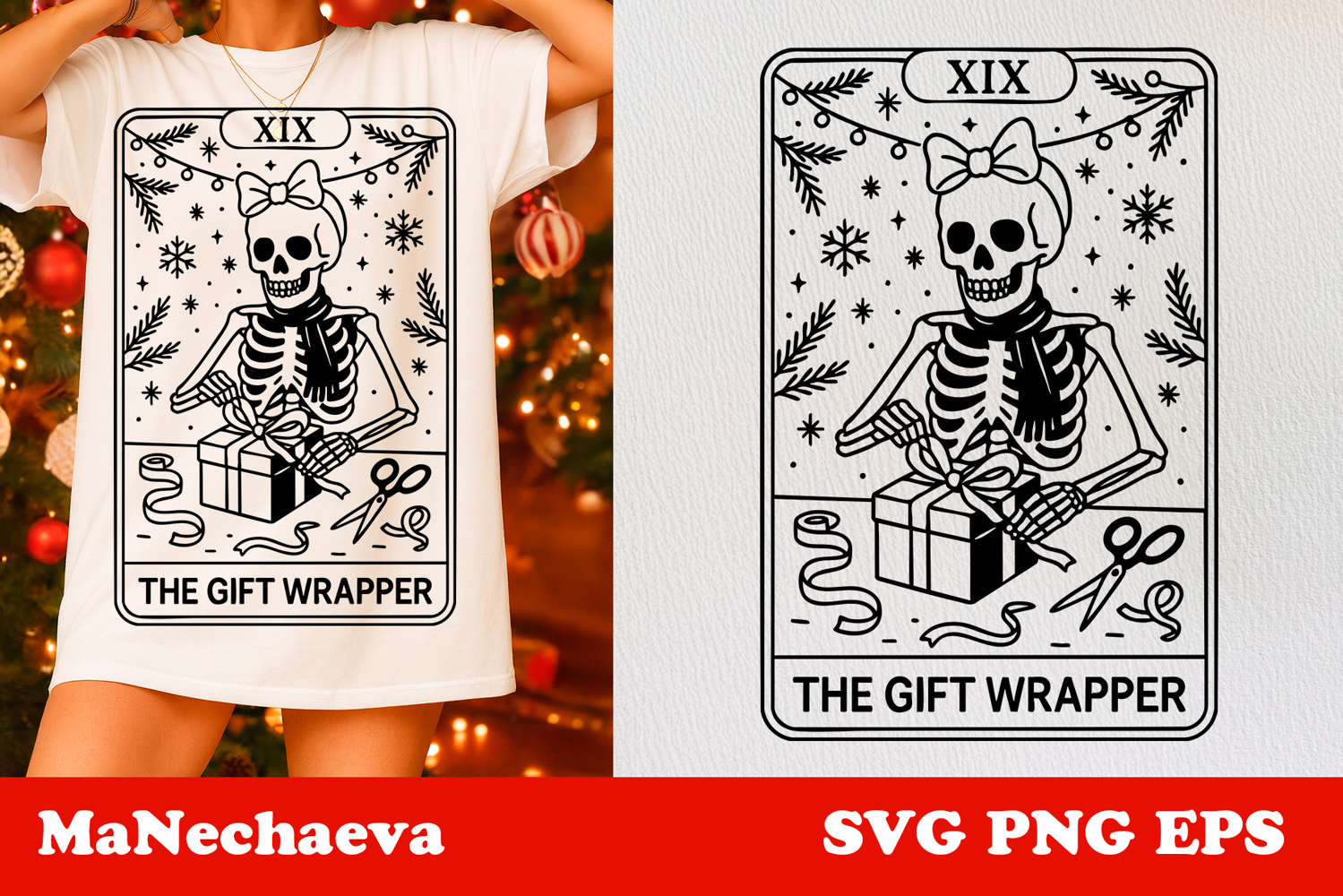 Black-and-white tarot card style design featuring a festive skeleton wrapping a gift with scissors, ribbon, and bows. Perfect for alternative Christmas décor, gothic holiday crafting, and unique seasonal apparel.