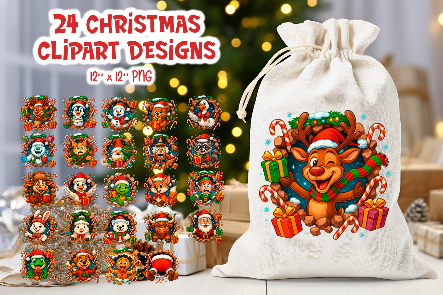 Celebrate the holidays with this funny Christmas clipart bundle! This big collection includes 24 playful designs of festive characters breaking through walls in a vibrant cartoon style. You’ll find Santa, elves, reindeer, penguins, polar bears, raccoons, foxes, gingerbread men, nutcracker, snowman, and more — each filled with holiday cheer, candy canes, and gifts.