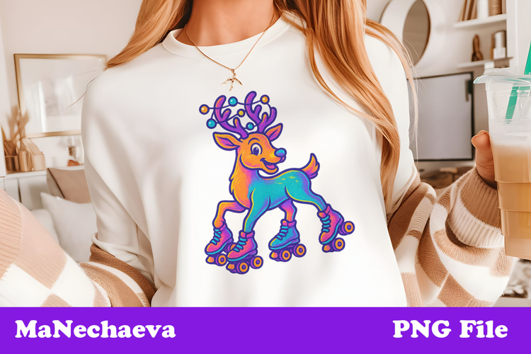 Roll into the holidays with this glowing neon reindeer on roller skates. The vibrant iridescent colors and playful pose make this design a perfect mix of festive and funky. A bold Christmas illustration that adds humor, energy, and a modern twist to traditional holiday art.