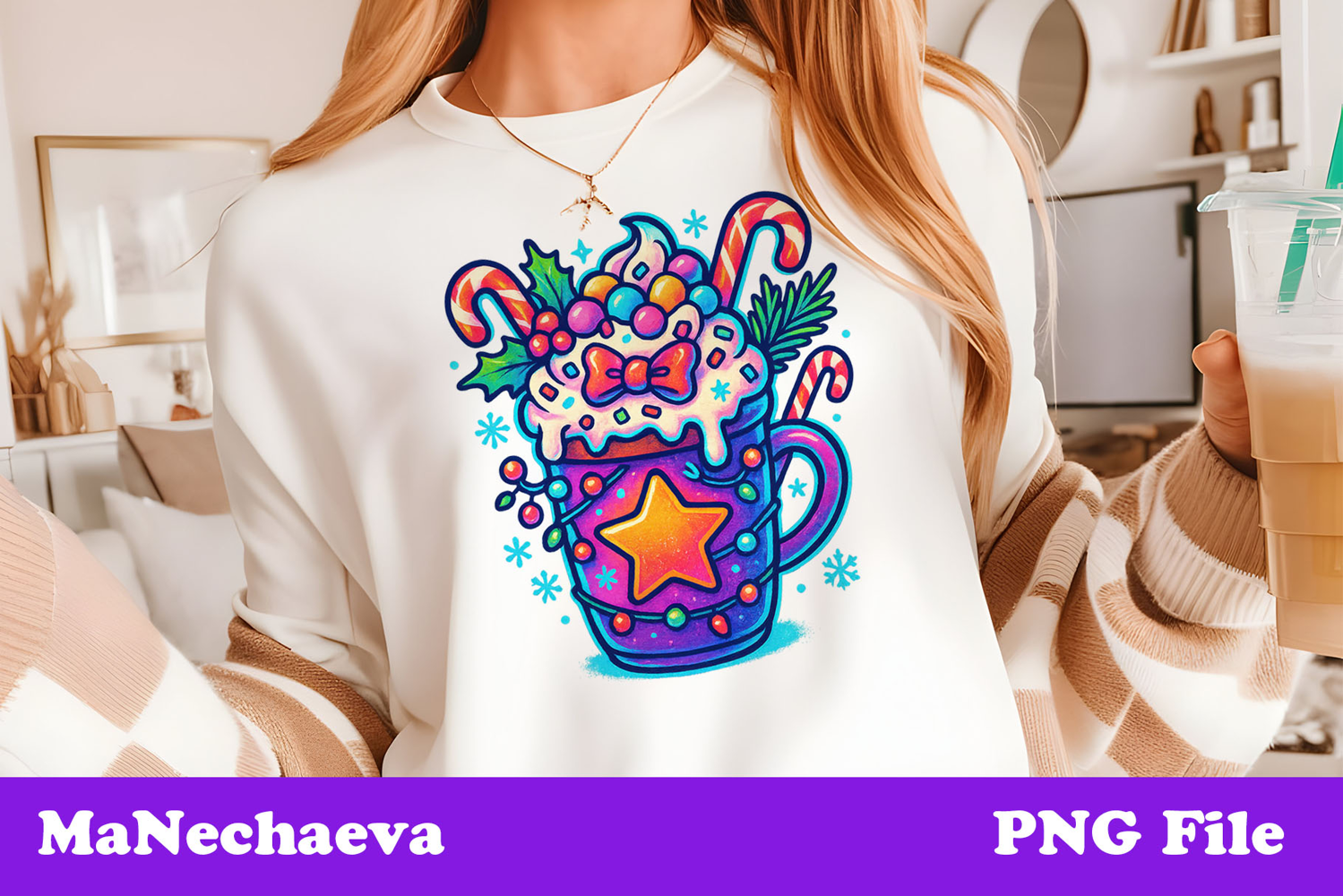 Sip festive cheer with this glowing neon Christmas mug filled with whipped cream, candy canes, holly leaves, and a big star. The playful iridescent design brings cozy warmth with a bold modern twist, making it the perfect element for holiday crafts. Fun, colorful, and full of holiday spirit!
