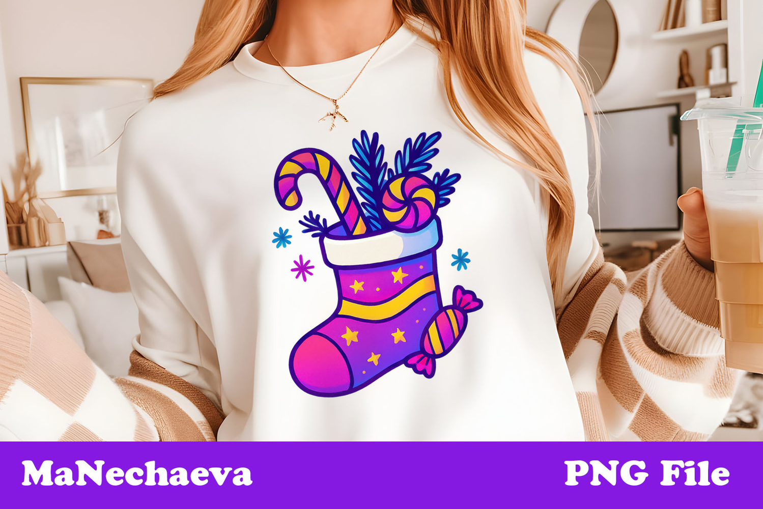 Brighten your holiday projects with this glowing neon Christmas stocking filled with candy canes, sweets, and festive greenery. The iridescent colors and bold cartoon style make it a perfect mix of cheerful, modern, and playful Christmas art. Great for adding a pop of fun and charm to your festive designs.