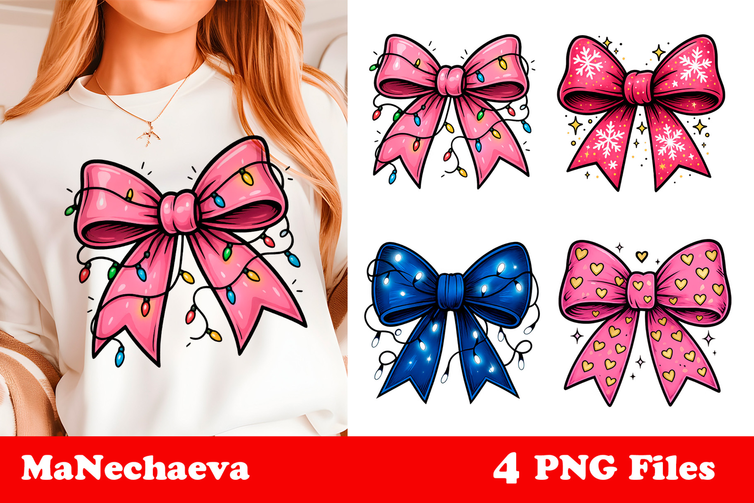 These glossy bows in pink and blue hues, decorated with fairy lights, hearts, and snowflakes, bring a whimsical and glamorous twist to traditional Christmas art. Perfect for sublimation and DTF printing, they instantly elevate your seasonal designs — from cozy mugs to stylish tote bags and festive apparel.
