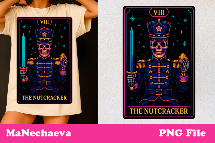 Enter the eerie world of The Nutcracker — a bold Christmas Skeleton Tarot Card glowing in vivid neon iridescent hues. This gothic twist on the classic Nutcracker soldier merges festive spirit with dark fantasy, perfect for holiday lovers who crave something unconventional. Great for DTF printing, sublimation, or gothic Christmas art collections.