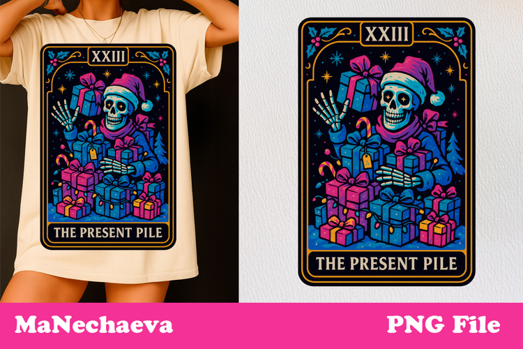 Celebrate the spooky side of giving with The Present Pile, a glowing Christmas Skeleton Tarot Card in dazzling neon tones. A cheerful skeleton in a Santa hat surrounded by candy canes and stacked gifts brings a wickedly festive vibe to your holiday designs. Perfect for DTF, sublimation, and gothic apparel.