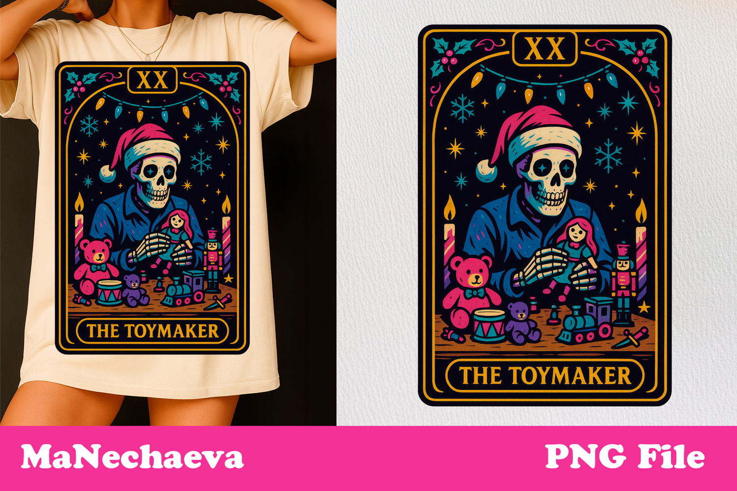 Step into a spooky workshop with The Toymaker, a glowing Christmas Skeleton Tarot Card crafted in dazzling neon hues. This skeletal Santa builds toys by candlelight — a haunting yet heartwarming design for DTF printing, sublimation, and gothic holiday collections.