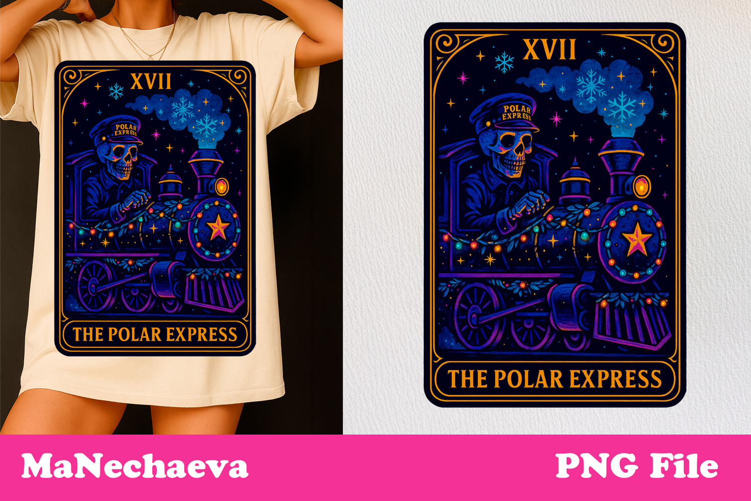 All aboard The Polar Express — a dazzling Christmas Skeleton Tarot Card where a skeletal conductor drives a glowing train through a cosmic winter night. With neon lights, snowflakes, and a gothic festive vibe, this design is perfect for DTF printing, sublimation, and eerie Christmas lovers.