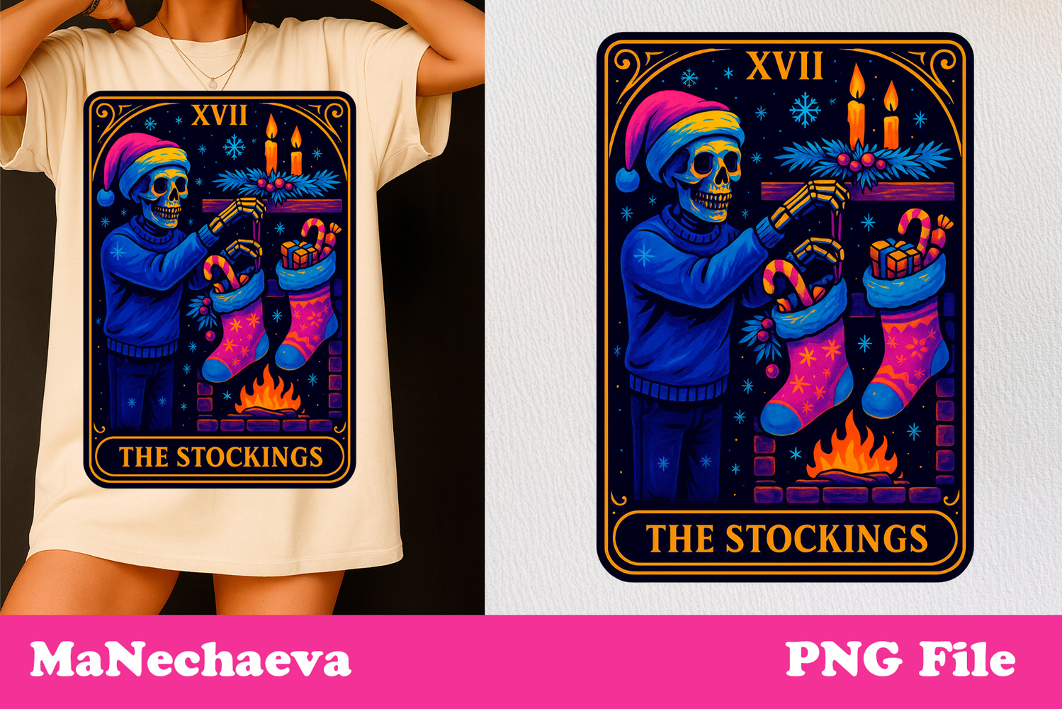 Unwrap the dark side of Christmas with The Stockings, a glowing Christmas Skeleton Tarot Card featuring a festive skeleton hanging candy canes and gifts by the fireplace. Neon tones, cozy chaos, and gothic holiday spirit — ideal for DTF printing, sublimation, and spooky Christmas apparel.