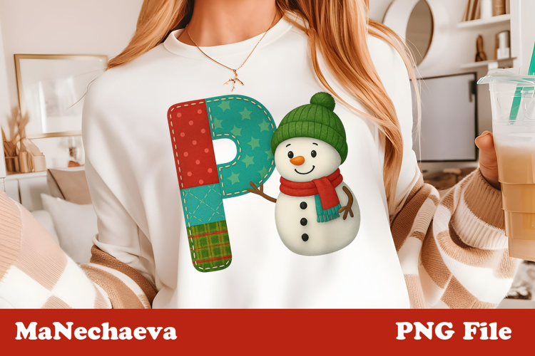 The letter “P” features a cheerful snowman in a green beanie and red scarf, next to a patchwork letter crafted in festive Christmas colors — red, green, and teal, with hand-stitched details.