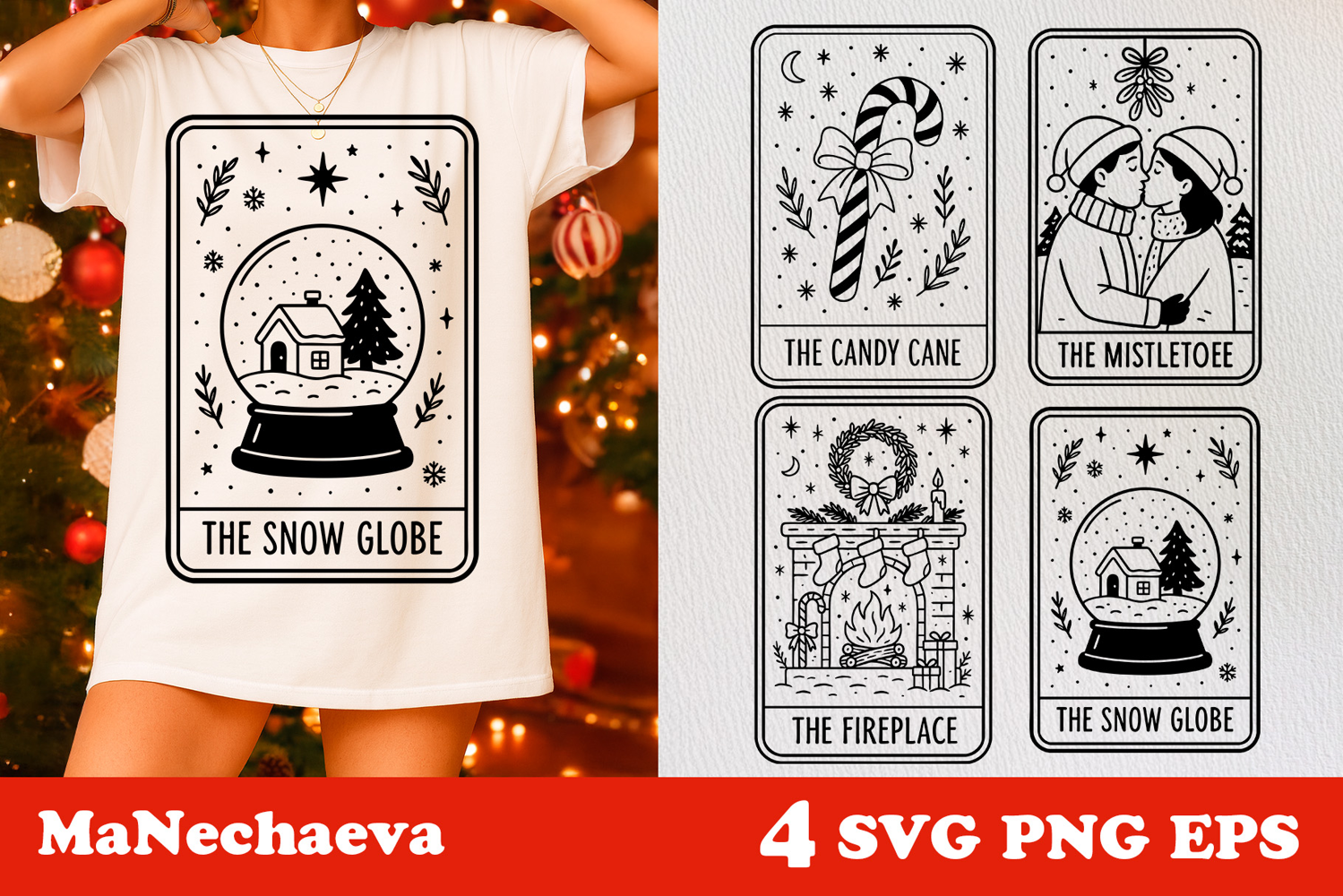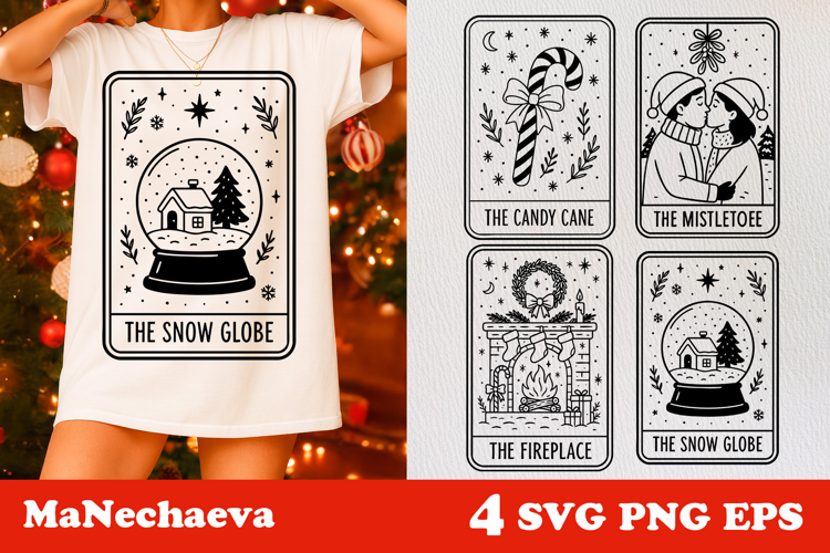 Discover the magic of the season with this Christmas Tarot Card SVG collection! Each design combines festive charm and vintage line-art style, featuring The Candy Cane, The Mistletoe, The Fireplace, and The Snow Globe. Perfect for adding cozy Christmas spirit to shirts, mugs, ornaments, tote bags, and other creative projects.