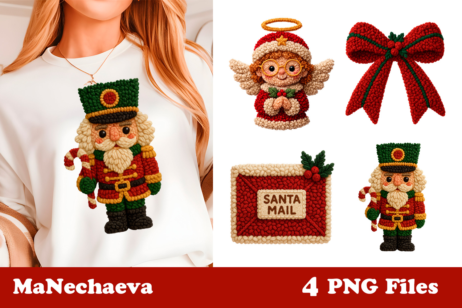 Bring cozy holiday charm to your projects with this latch hook yarn Christmas sublimation clipart featuring textured winter characters and festive elements. This fluffy yarn-style artwork includes a nutcracker, angel, large Christmas bow and Santa mail card, designed in a soft tufted look that creates a warm, nostalgic holiday atmosphere.