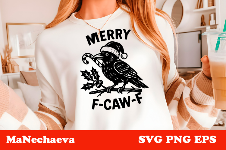 This funny Christmas raven design features a bold black crow wearing a Santa hat, holding a candy cane and perched on a winter branch with holly details, paired with the sarcastic holiday phrase “Merry F-CAW-F.” The illustration mixes dark humor with festive charm, making it perfect for standout seasonal designs, witty gifts, and eye-catching holiday projects.