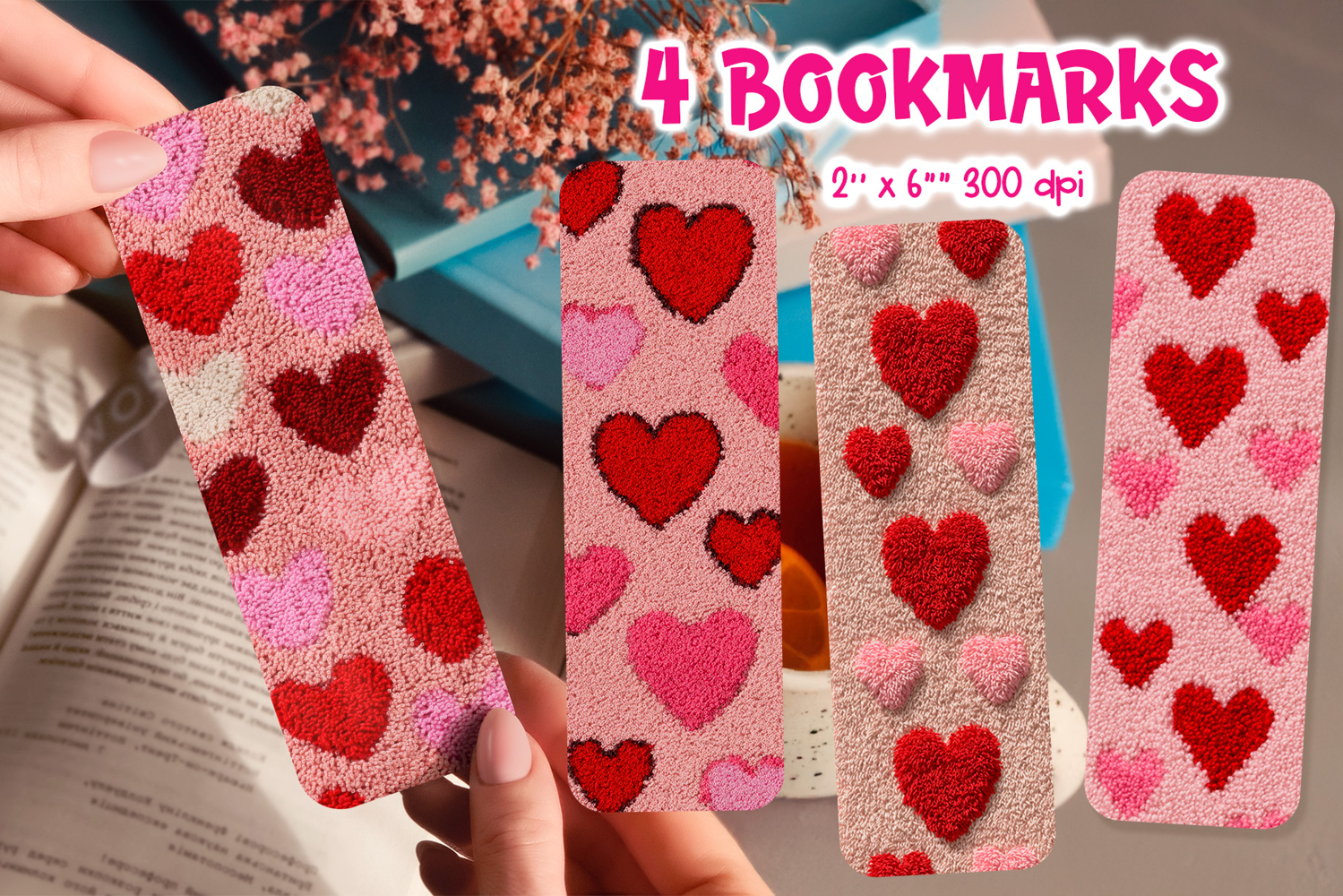 Valentine’s Day bookmarks featuring repeating heart motifs created in a latch hook yarn texture with a soft, looped, textile-inspired surface.