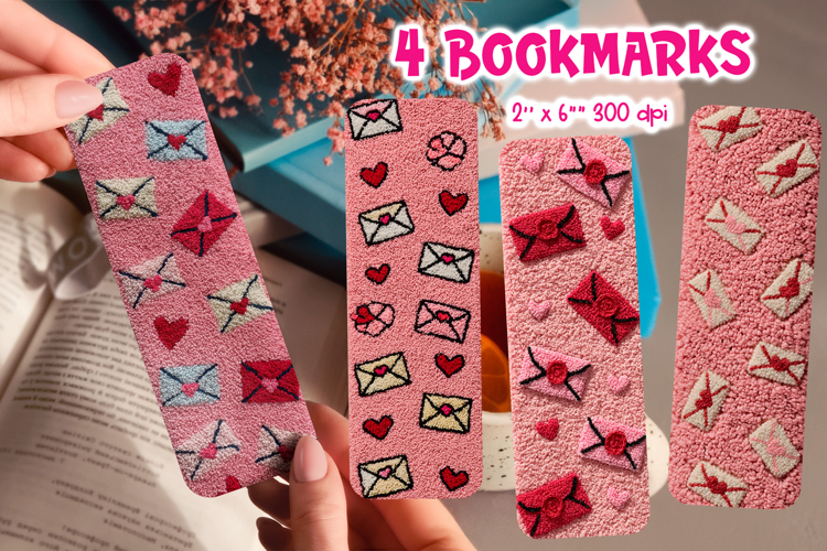 This Valentine’s Day bookmark design features soft latch hook yarn textures with romantic love letter envelopes and heart details. The bookmarks showcase plush yarn envelopes, sealed letters, heart accents, stitched outlines, and raised looped textures arranged on warm pink backgrounds.
