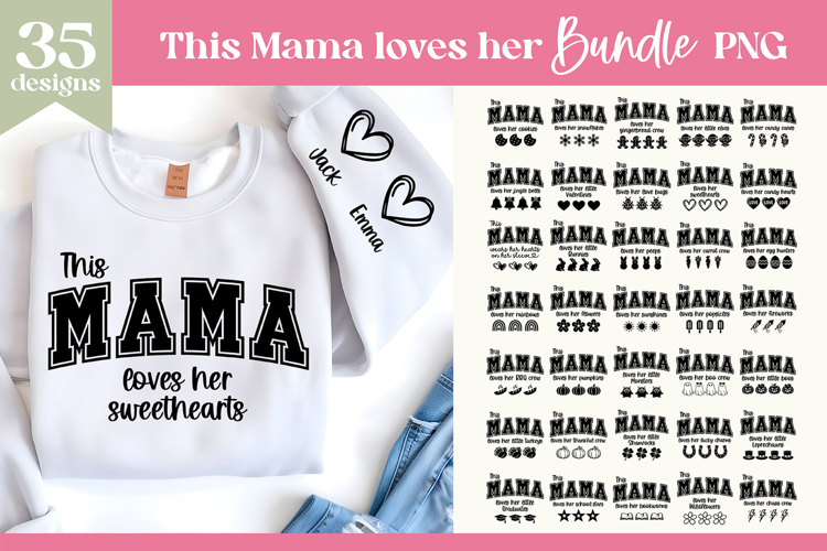 This “This Mama loves” design collection is created for mom shirts and sweatshirts with matching small icons made to place on sleeves next to children’s names. The set is fully multi-seasonal and includes everyday designs as well as holiday themes for Mother’s Day, Christmas, Valentine’s Day, St. Patrick’s Day, Halloween, 4th of July, and Thanksgiving.