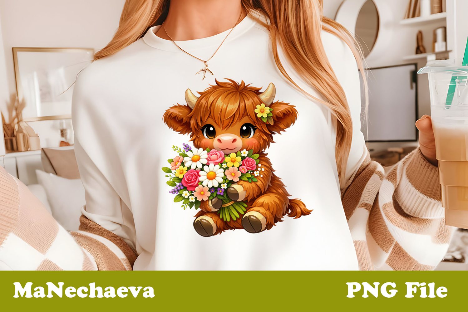 This adorable spring floral highland cow illustration features a sweet baby cow holding a colorful bouquet of wildflowers. Soft pastel tones and glossy cartoon details make this design perfect for spring themed creations, farm inspired gifts, apparel and seasonal handmade products.