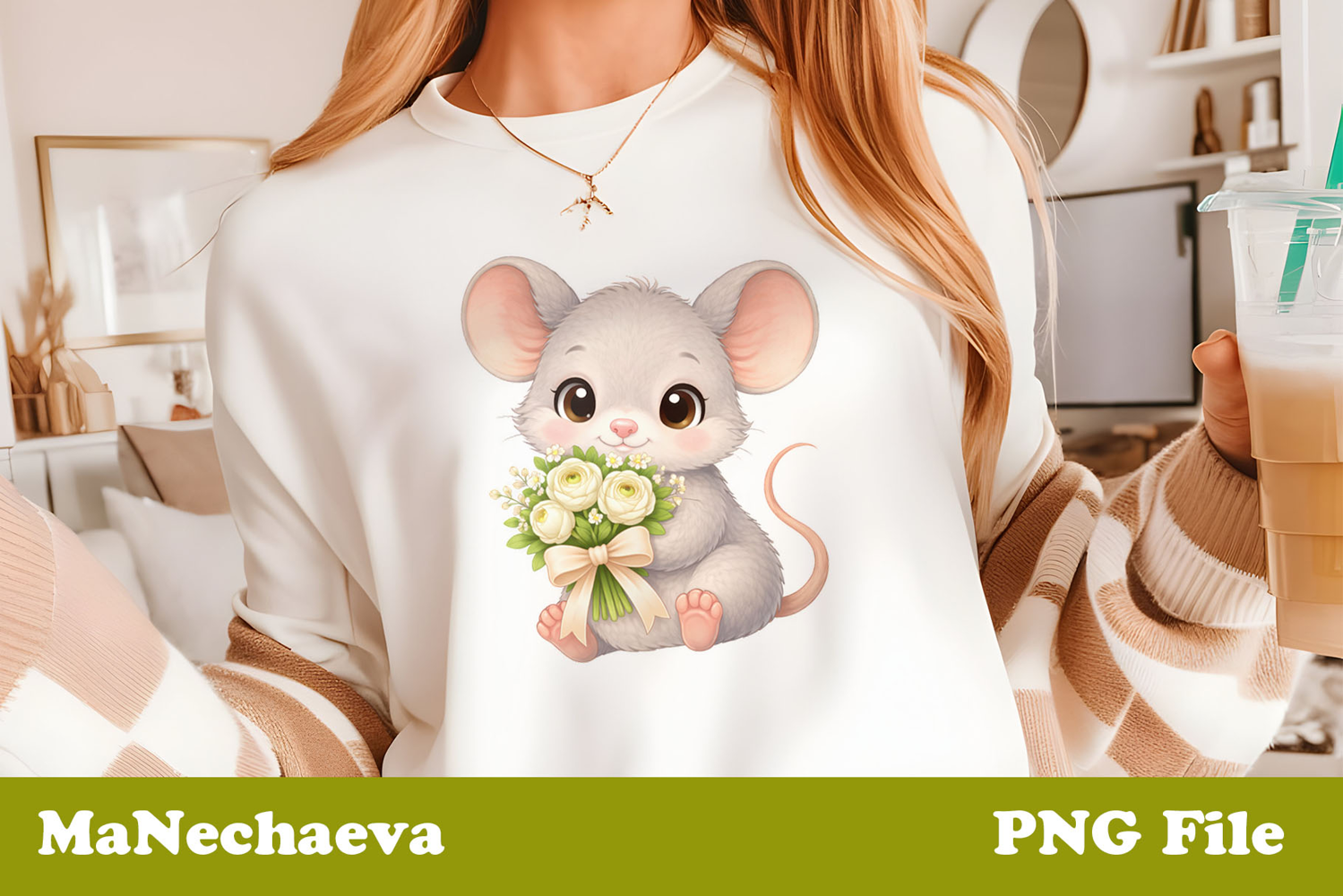 This sweet spring floral baby mouse illustration features an adorable grey mouse holding a delicate bouquet of soft white roses tied with a cream bow. Gentle pastel tones and glossy cartoon details make this design perfect for seasonal apparel and charming handmade gifts.