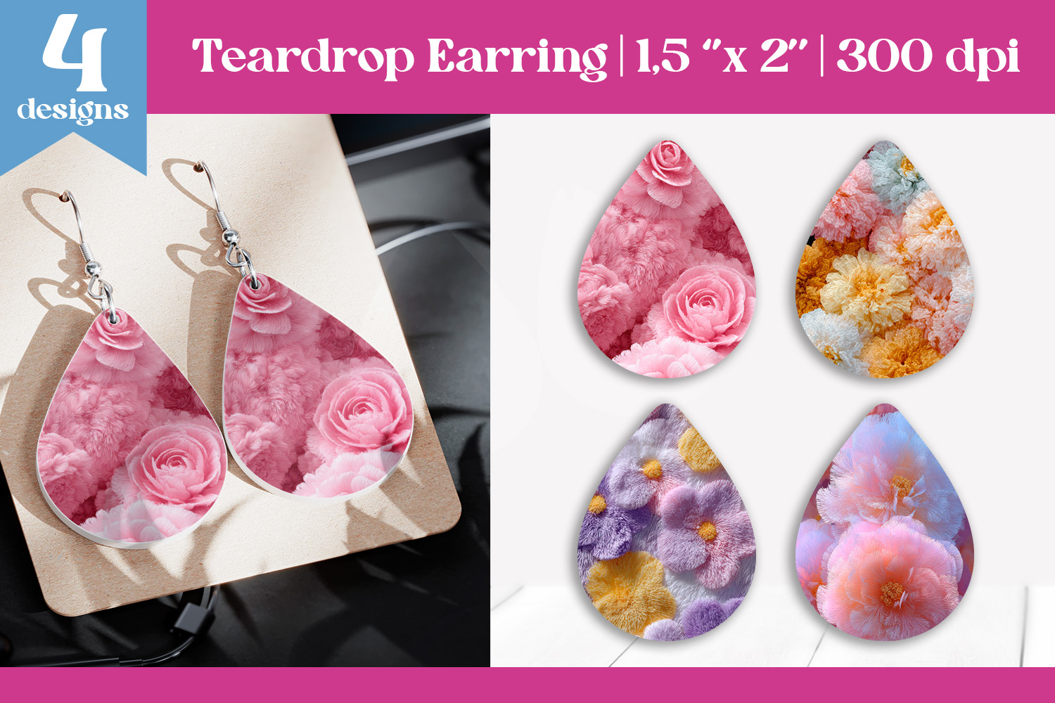 Floral faux fur texture teardrop earring sublimation design featuring soft fluffy spring flowers inside classic teardrop shapes. Bright botanical patterns and vibrant colors create eye-catching jewelry graphics perfect for sublimation printing and handmade accessories.