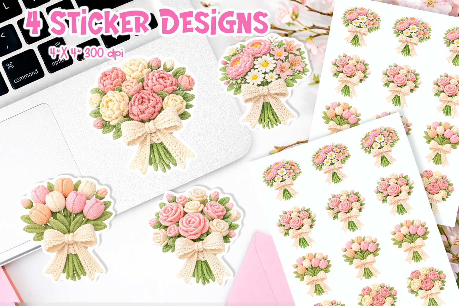 Delicate crochet flower bouquet sticker designs featuring pastel roses, tulips, daisies and peonies tied with a textured bow. Soft yarn texture and cozy handmade aesthetic create charming floral artwork perfect for planners, journaling and decorative projects.