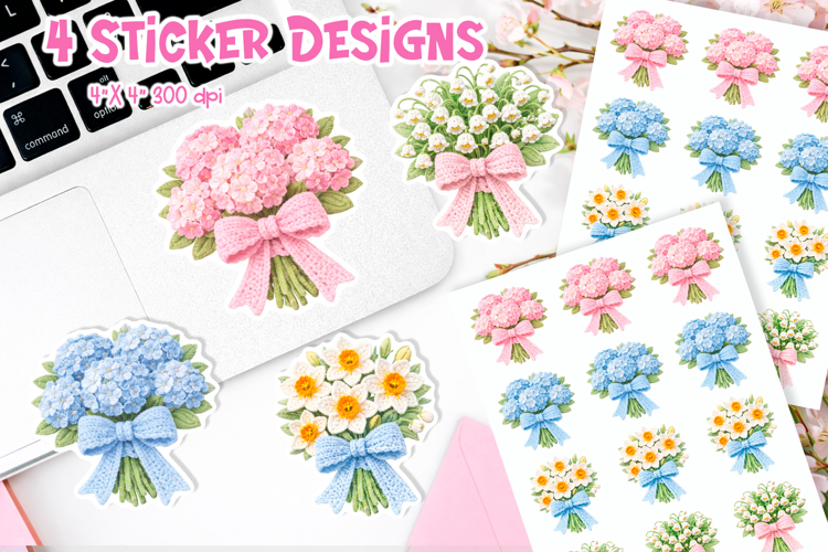 Beautiful crochet flower bouquet sticker designs featuring soft pink lilies, delicate cherry blossoms, fragrant lavender and blue bellflowers tied with textured pastel bows. Detailed yarn texture and cozy handmade aesthetic create elegant spring floral artwork perfect for planners, journaling and decorative projects.