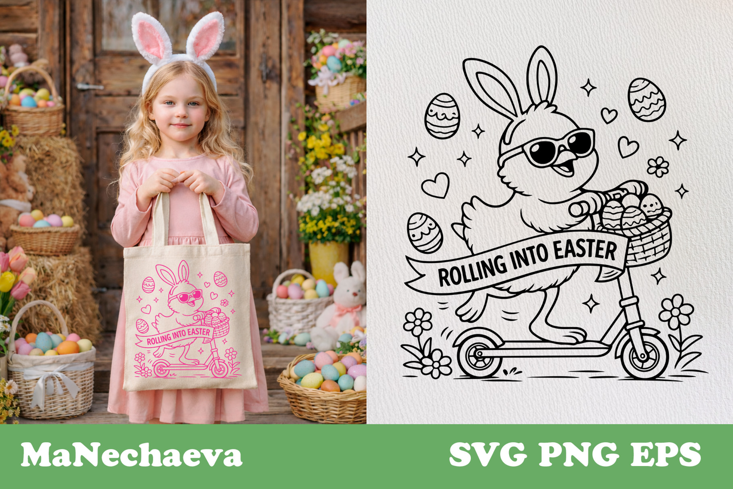 Playful Easter design featuring a cute chick riding a scooter with bunny ears and sunglasses while carrying a basket full of decorated eggs, paired with the phrase “Rolling Into Easter”. This fun animal illustration has a lively composition with festive details and clean bold outlines.