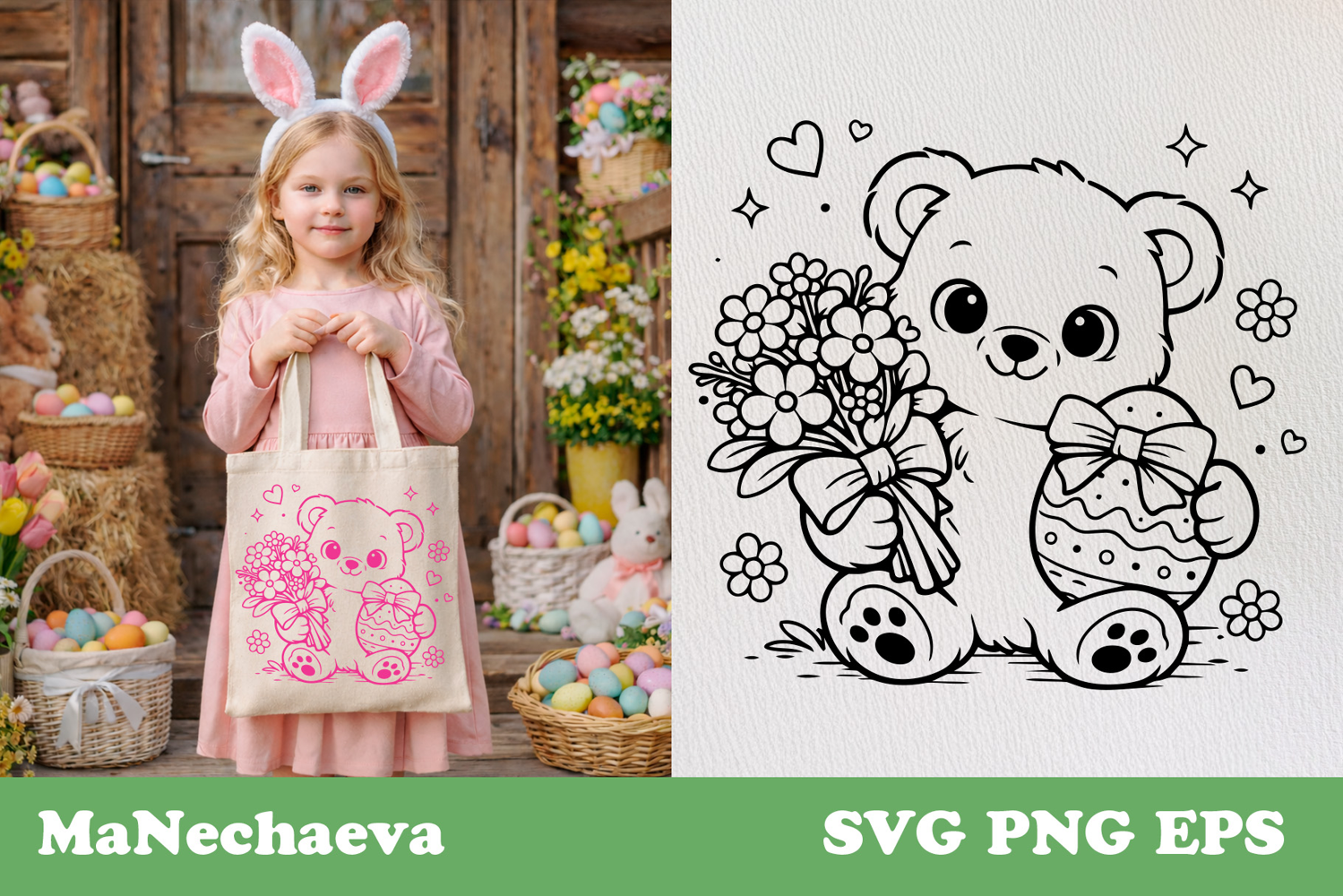 Adorable Easter design featuring a cute teddy bear holding a bouquet of flowers and a decorated Easter egg with a bow surrounded by spring elements. This charming illustration has a soft cozy feel with clean bold outlines and a gentle seasonal vibe.