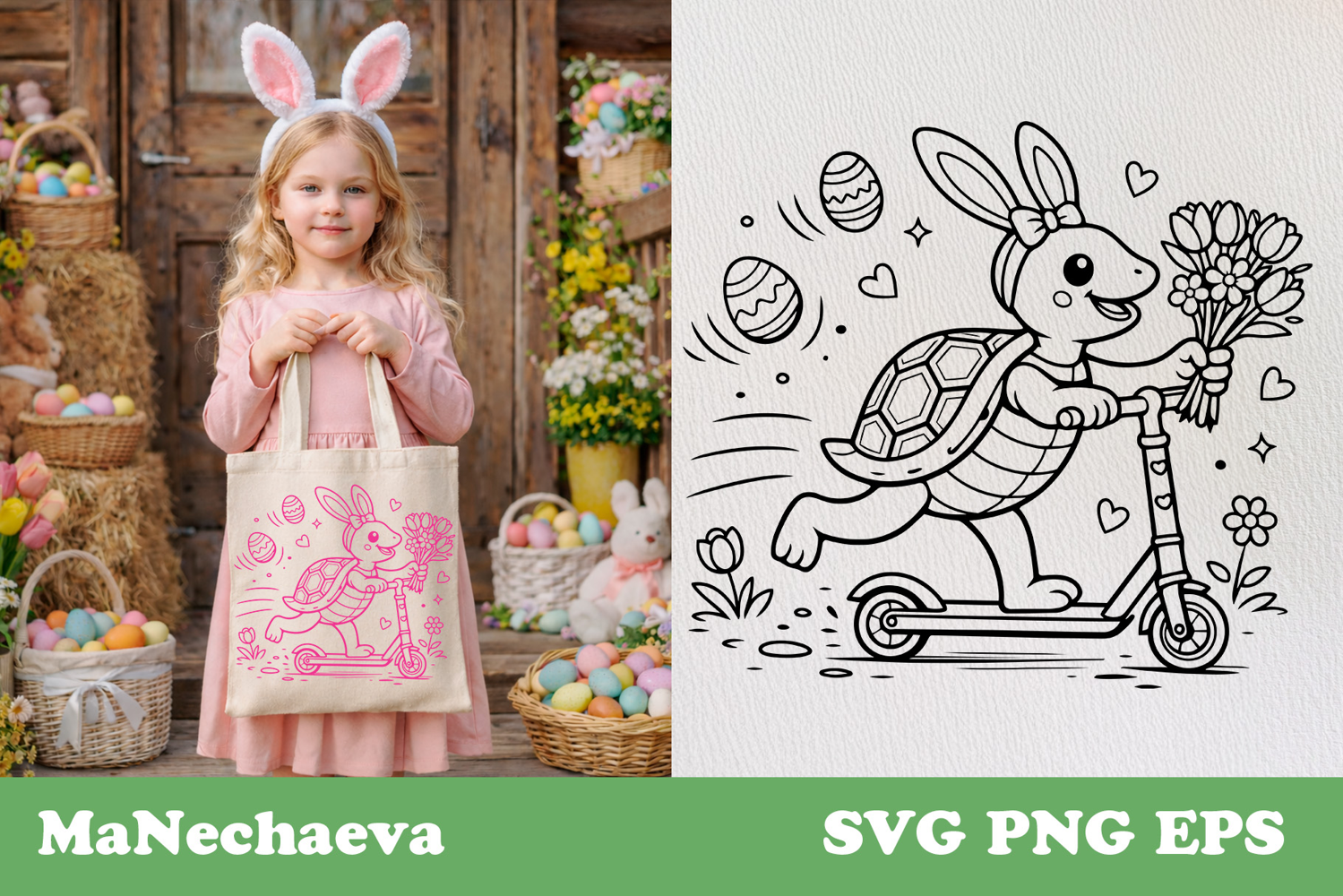 Charming Easter design featuring a cute turtle wearing bunny ears riding a scooter while holding a bouquet of flowers. Playful motion, sweet details and decorated Easter eggs create a lively and joyful spring composition in a clean bold outline style.