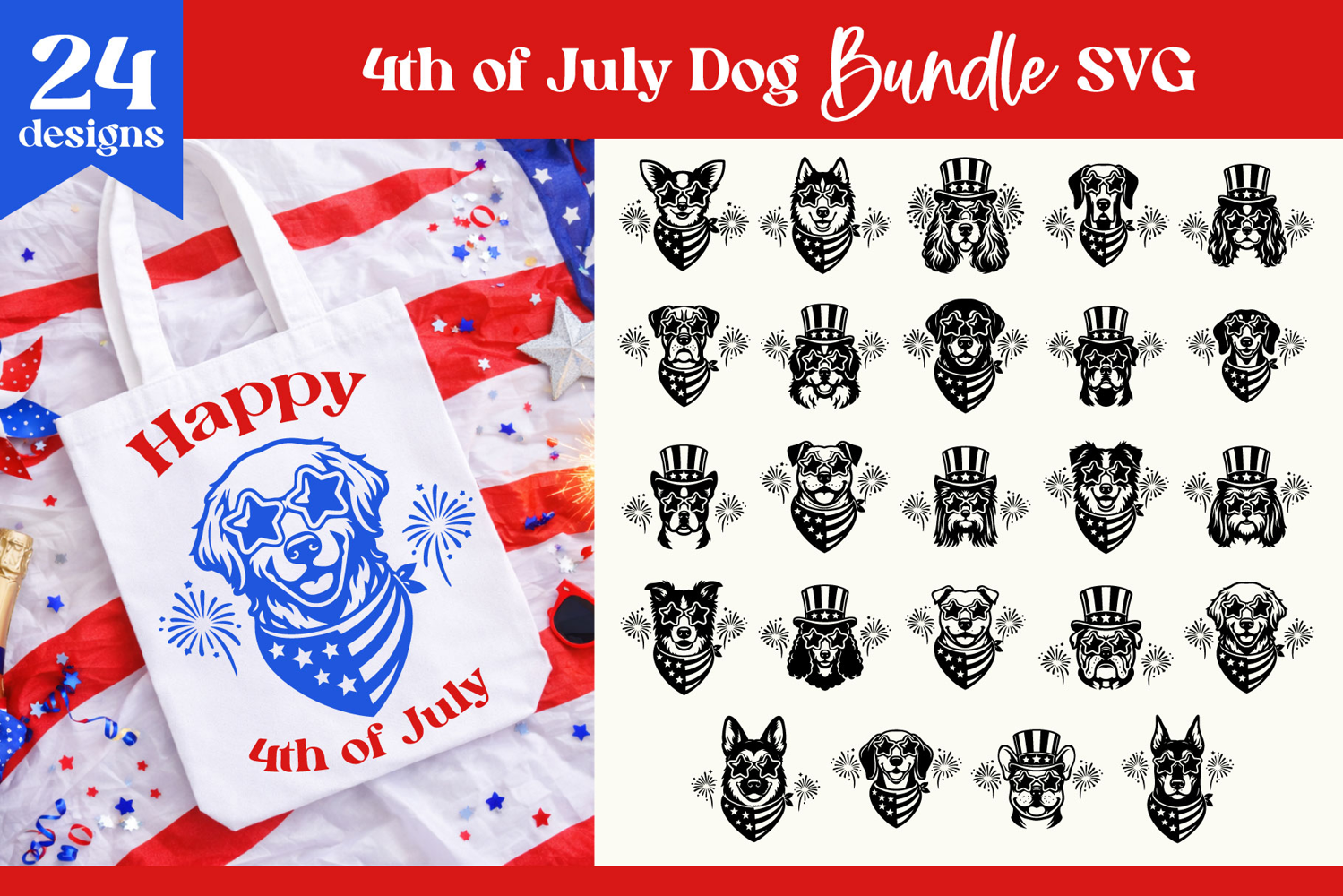 Bold patriotic dog collection featuring 24 unique designs with different dog breeds wearing American themed accessories like star glasses, bandanas and Uncle Sam hats. Clean black silhouettes with strong contrast make these designs perfect for cutting and high-quality printing.