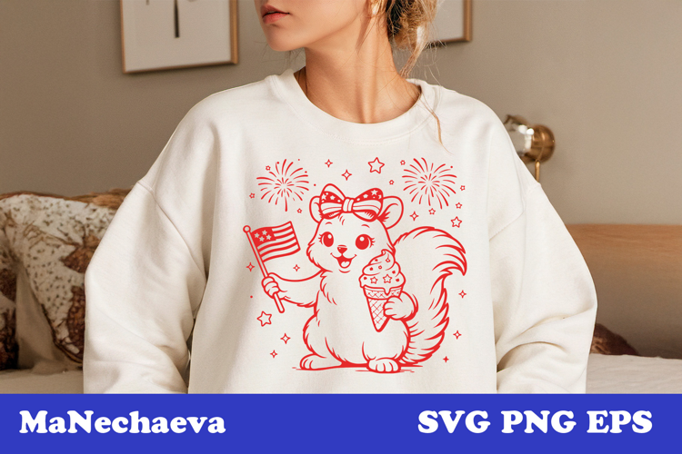 Celebrate Independence Day with this adorable and eye-catching patriotic squirrel design. This cute animal character with a festive bow, holding an American flag and enjoying ice cream, surrounded by fireworks and stars, creates a cheerful and heartwarming summer composition.