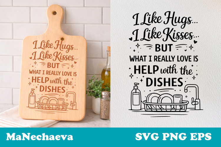 Playful and relatable kitchen design featuring a sink with dishes and the phrase “I Like Hugs… I Like Kisses… But What I Really Love Is Help with the Dishes”. This humorous illustration adds a light and cheeky personality to your kitchen, combining expressive typography with clean hand-drawn details.