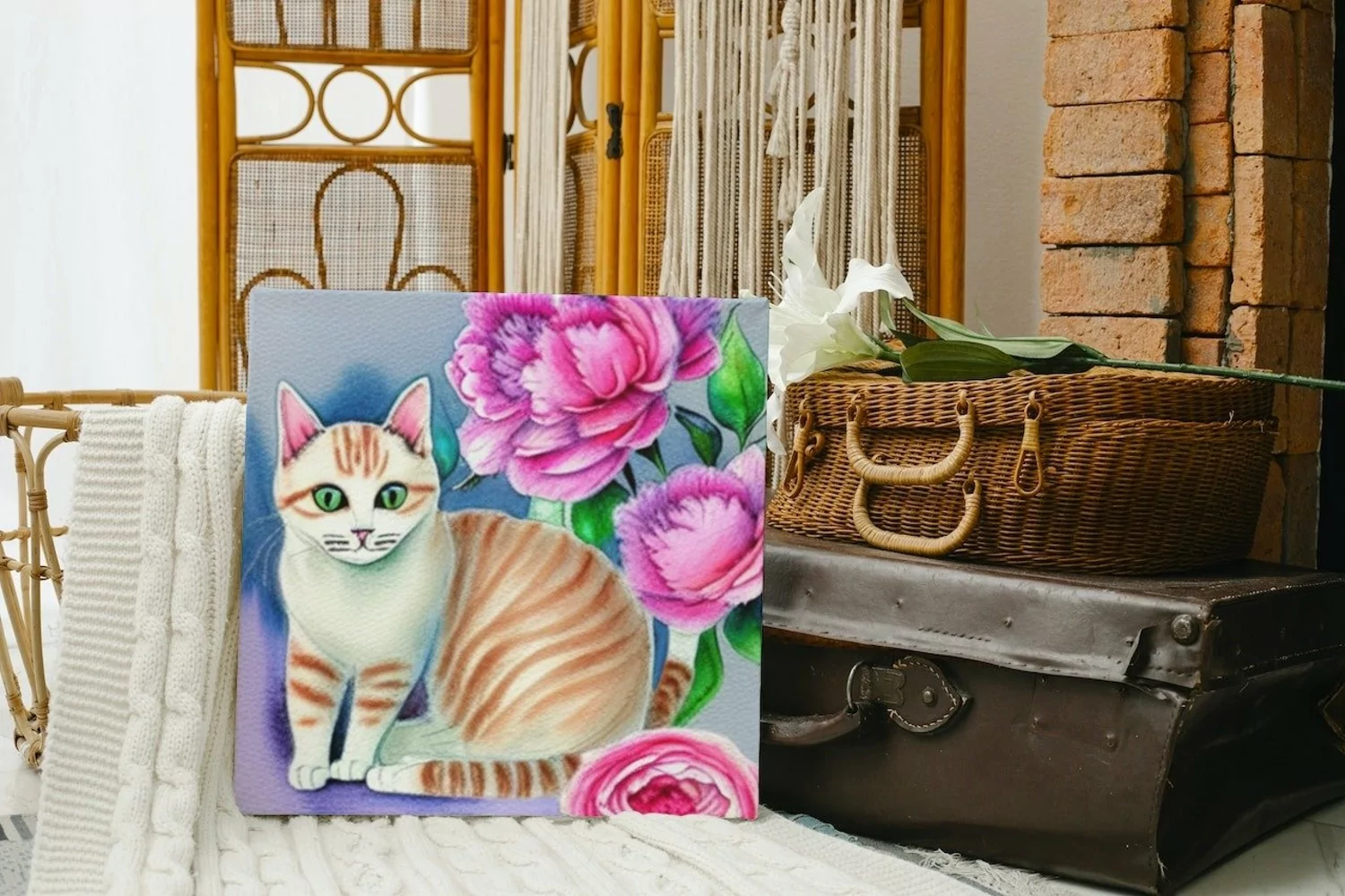 This painting is of a watercolor cat with peonies. The colors are vibrant, and the drawing is intricate.