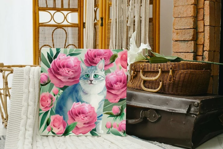 This painting is of a watercolor cat with peonies. The colors are vibrant, and the drawing is intricate.