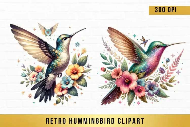 Similar Design Products to Flowers Hummingbird Clipart, Retro Hummingbird Clipart