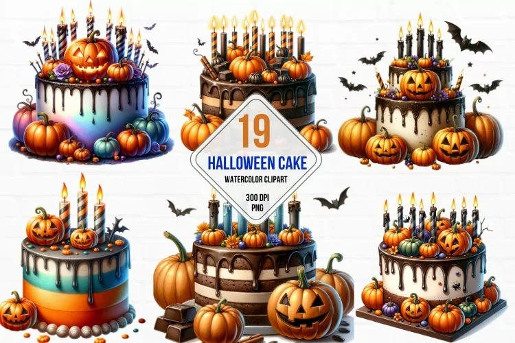 Watercolor Halloween Party Cake Clipart Bundle