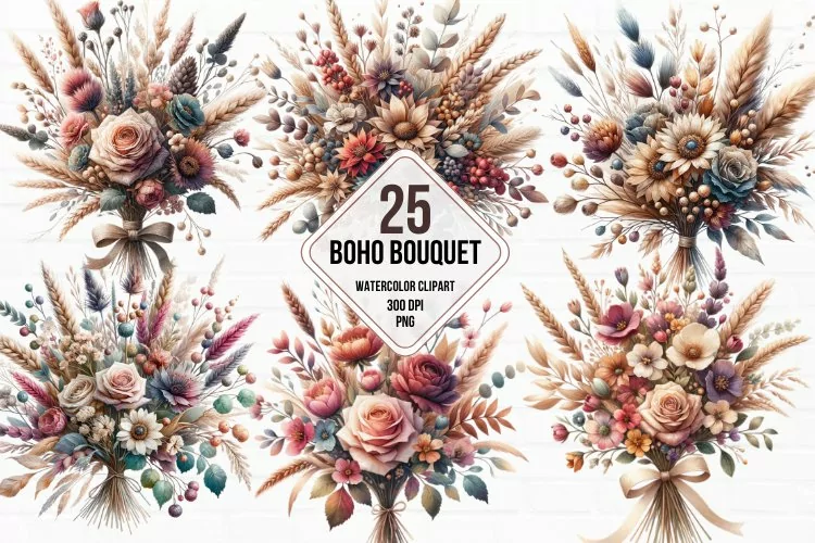 Watercolor boho bouquet clipart, Boho Flowers Bundle