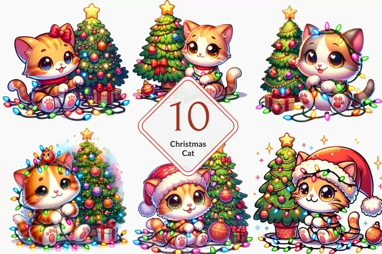 Watercolor Christmas Cat clipart, Cat Sublimation bundle
