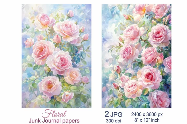 Watercolor Flowers Scrapbook Paper Pink Roses Floral Background Flower Digital Paper Floral Card Garden Flowers Junk Journal Pages Junk Journal Paper Scrapbook Cover