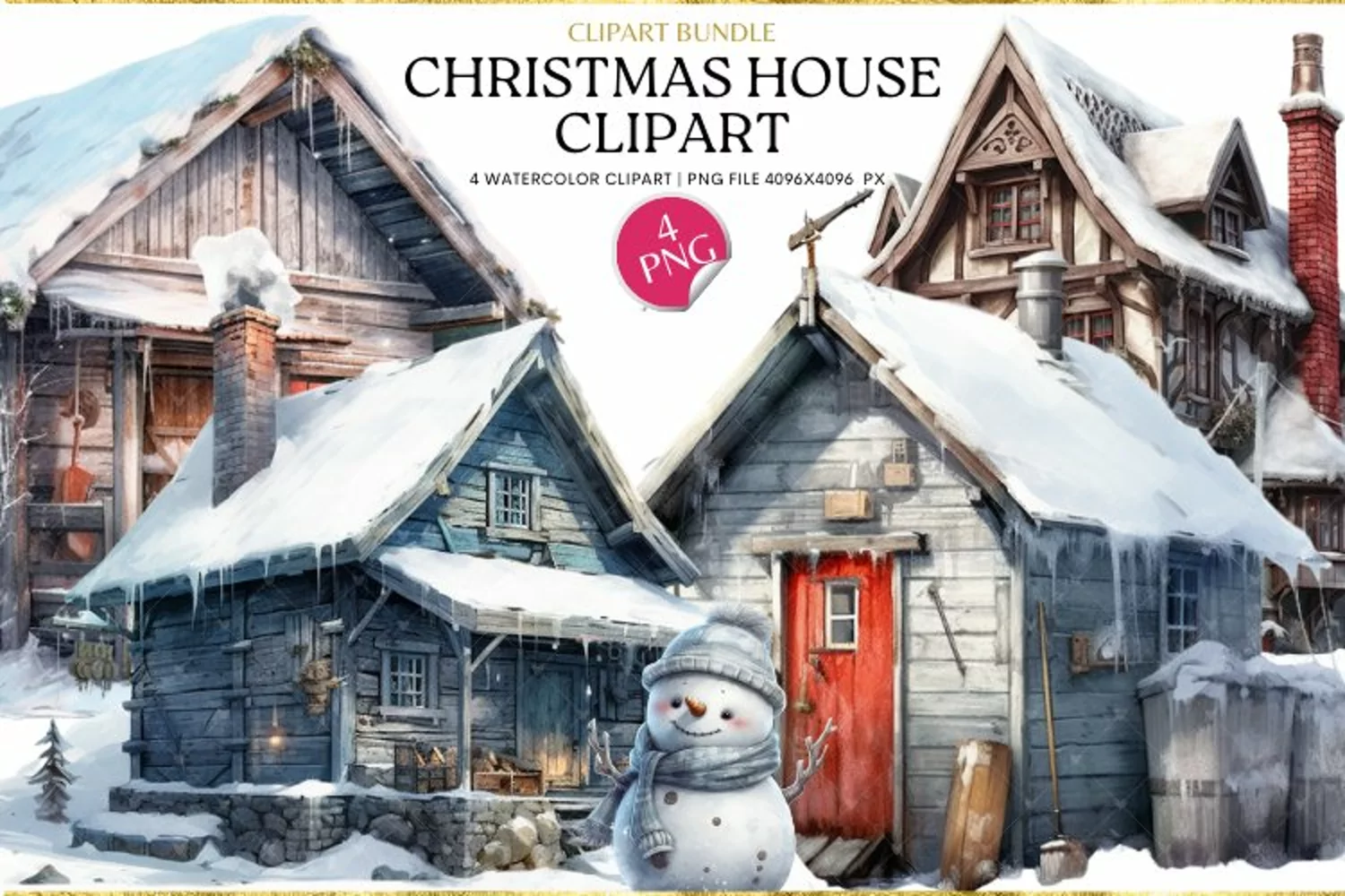 4 Christmas House Clipart Bundle, Christmas Houses Bundle