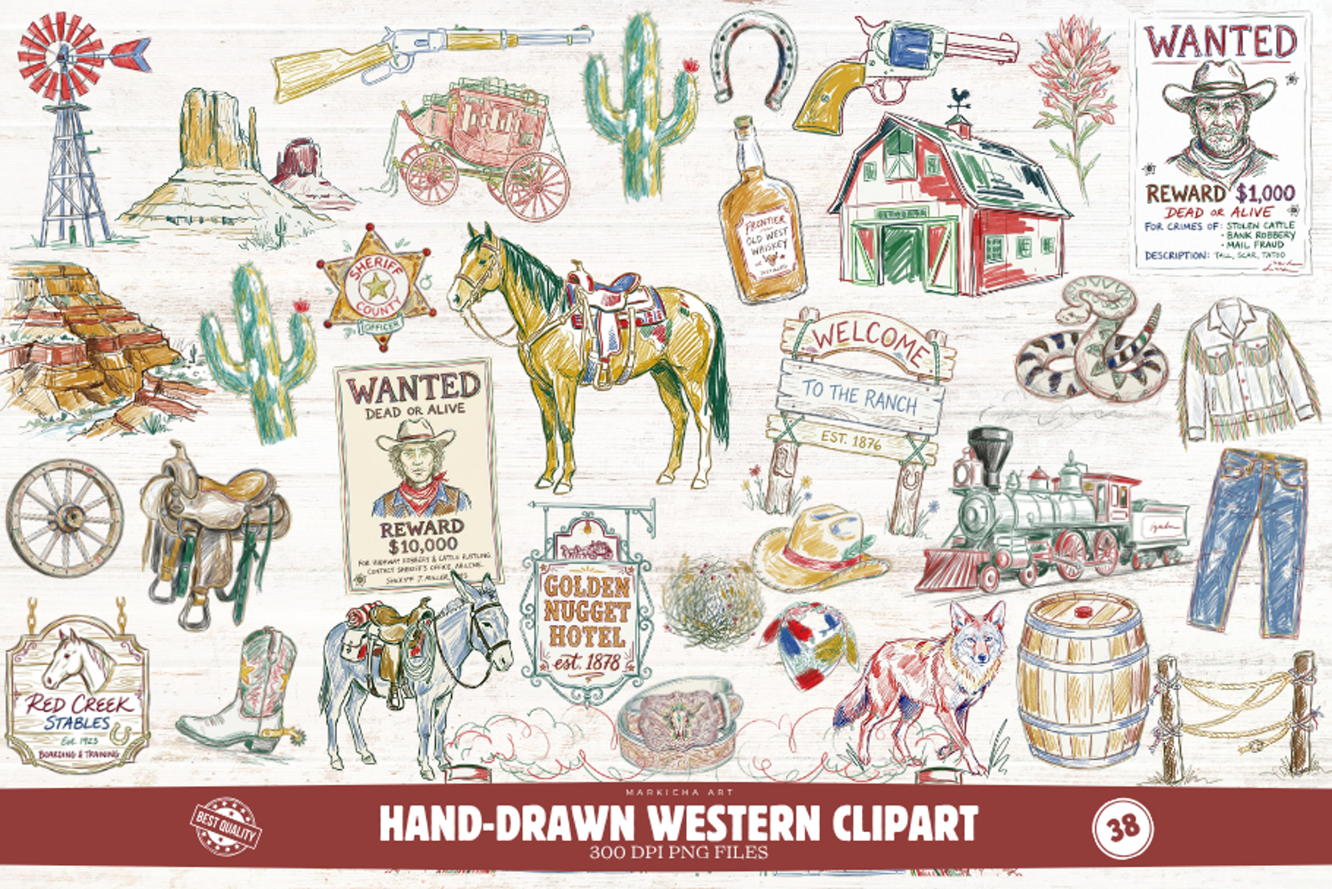 Cowboy Clipart Desert Cactus Clipart Cowgirl Illustration Horseshoe Illustration Western Clipart Png Western Boots Clipart Western Hat Png Rustic Western Clipart Hand-drawn Western Western Scenery Png