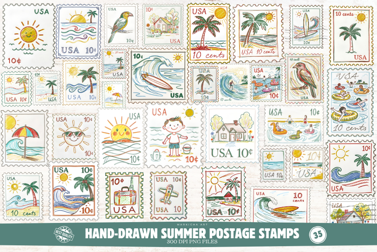 Similar Design Products to Hand-Drawn Summer Postage Stamps Clipart