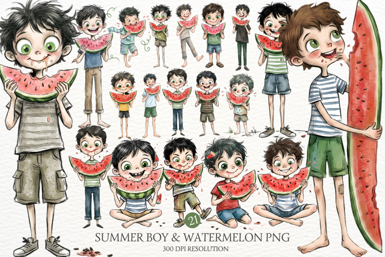 Whimsical Summer Boy & Watermelon Clipart