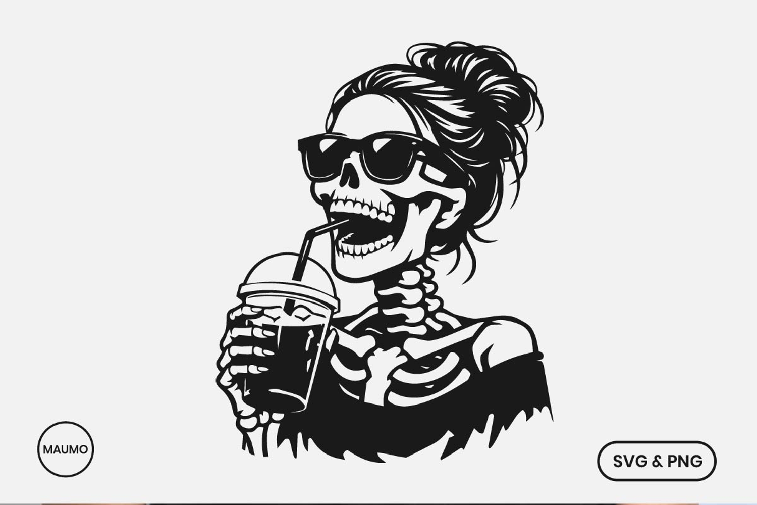 Add some “spooky-chic” to your portfolio with this premium Skeleton Messy Bun illustration. Featuring a stylish skeleton rocking sunglasses and her favorite iced drink.