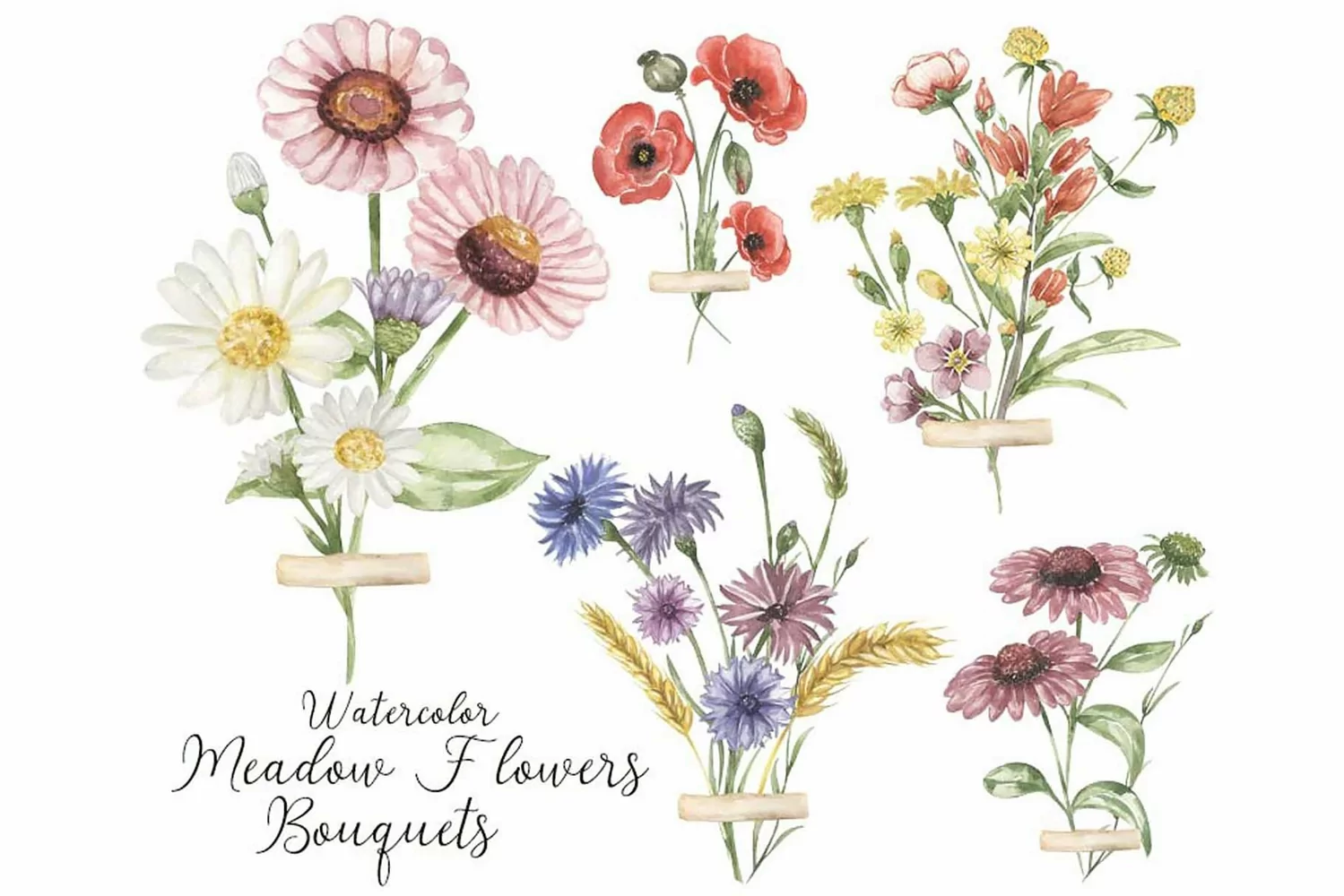 Watercolor Wildflowers Bouquet Clipart Set example image 1