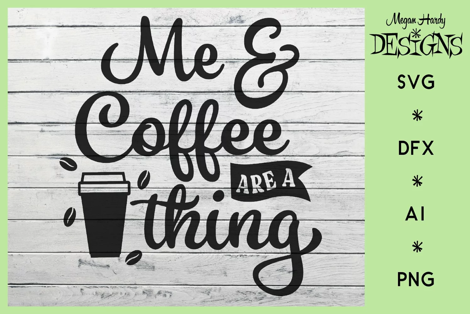 Me And Coffee Are A Thing vector design is available for immediate download. Show your love for coffee or share this design with the coffee lover in your life.